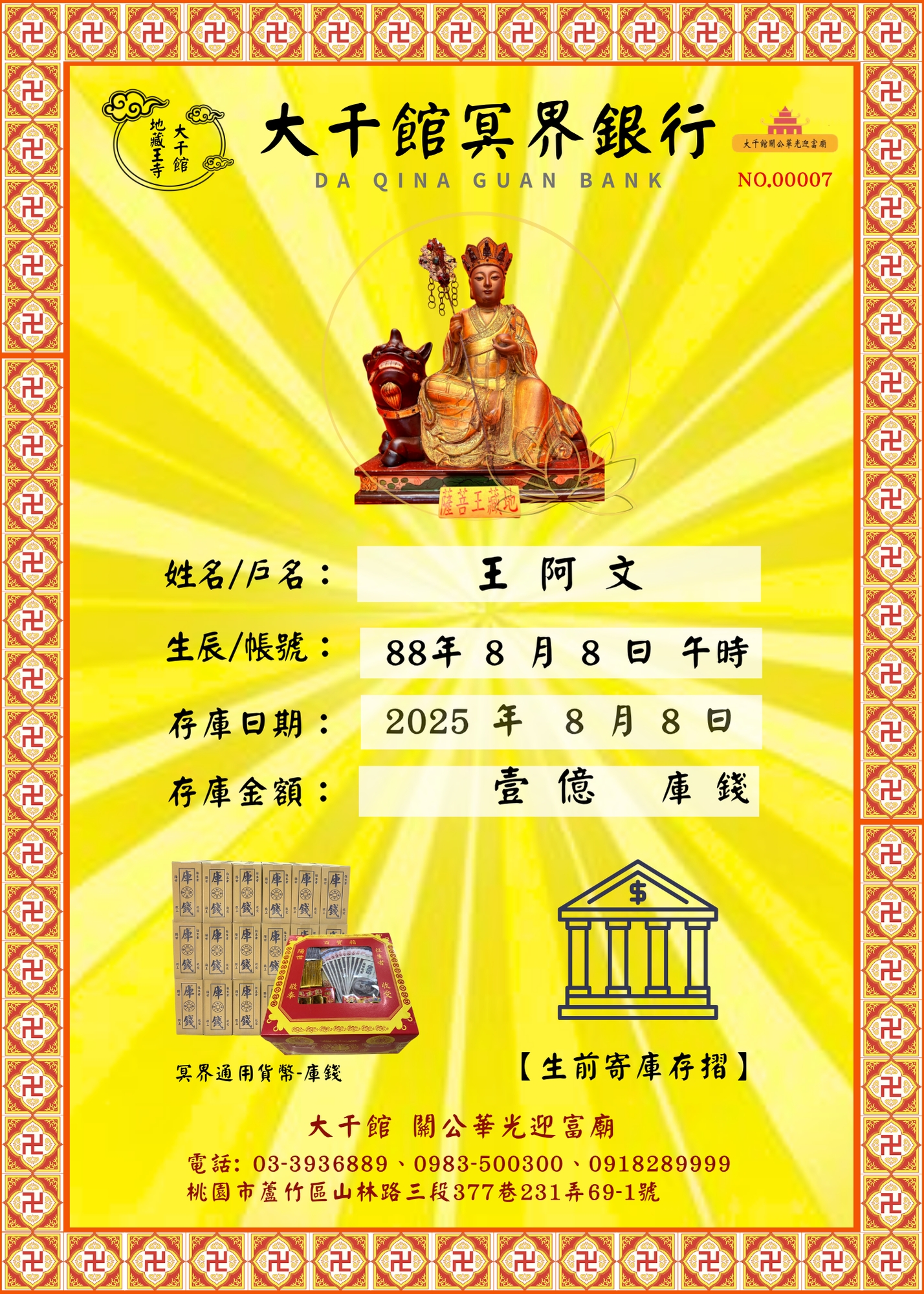 「庫錢權狀」象徵您在冥界的資產權益,由大千館地藏王寺–地藏王菩薩授證,附有大千館‧地藏王寺聖旨寶印加持,是您在冥界的財富保證書。